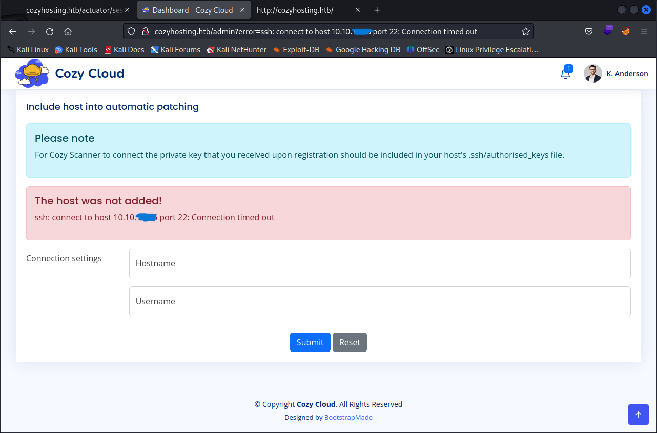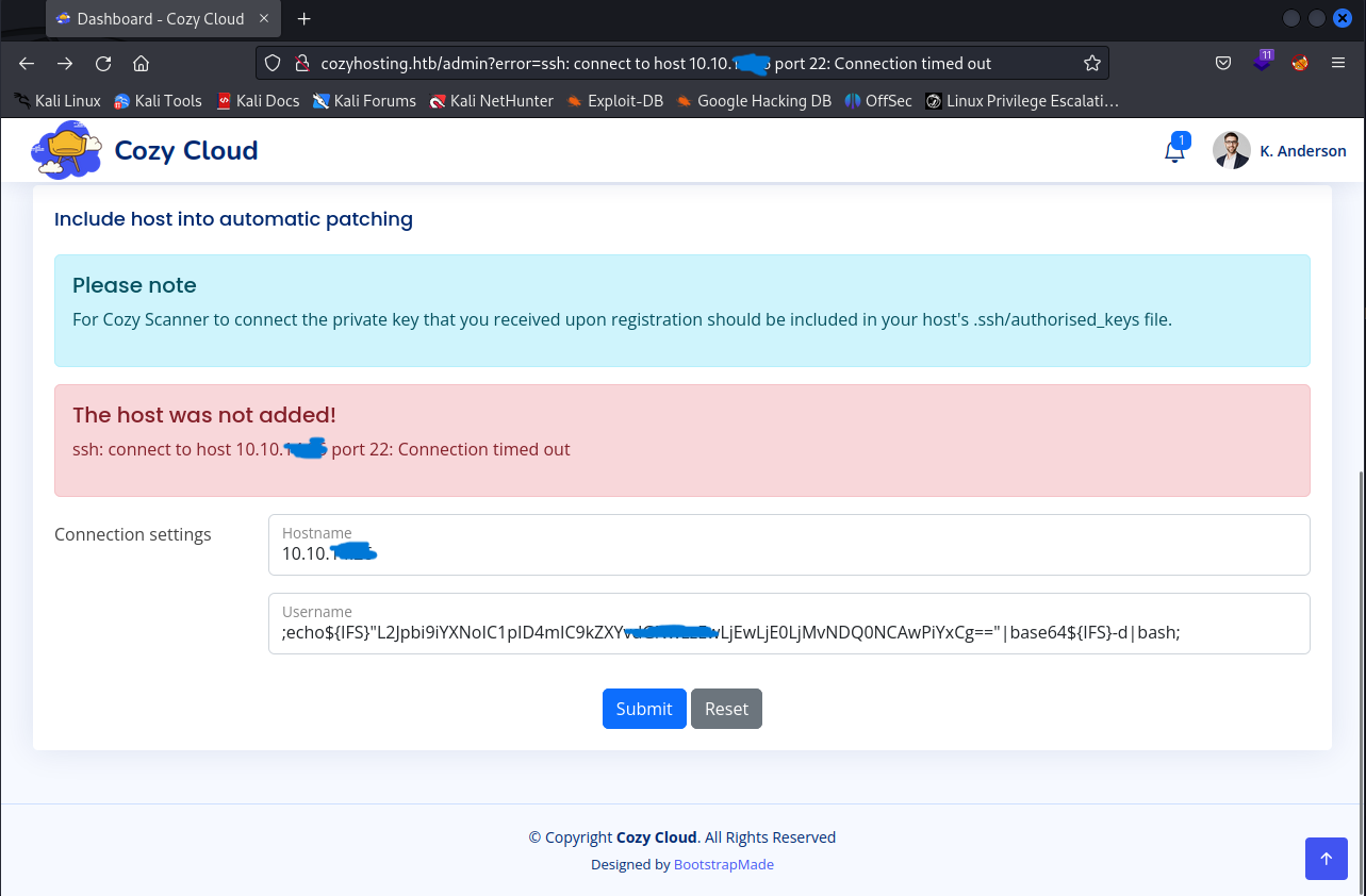 Clicking around and seeing what we can do as this user I realized that this page most likely has a RCE (Remote Code Execution) vulnerability, more specifically the Username parameter due to the fact that we can see an ssh error.