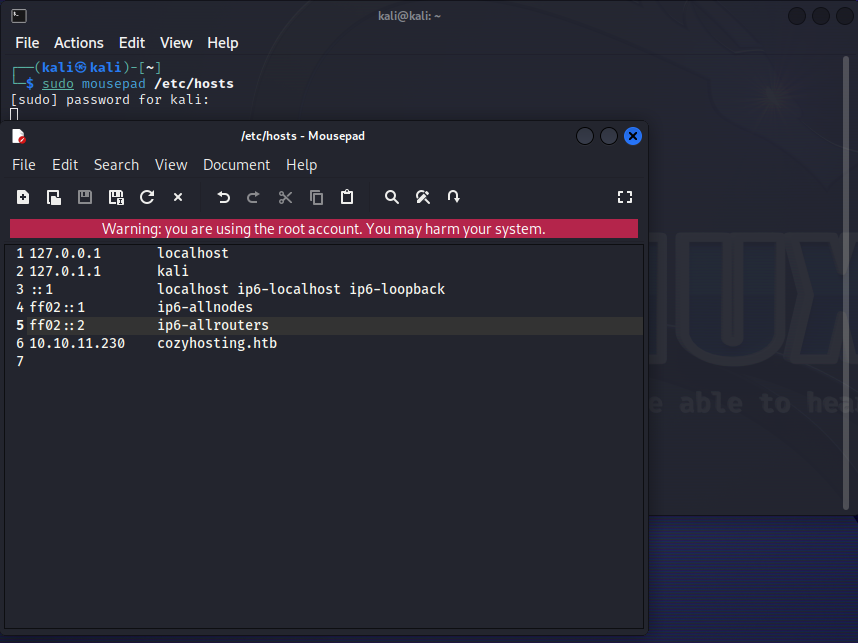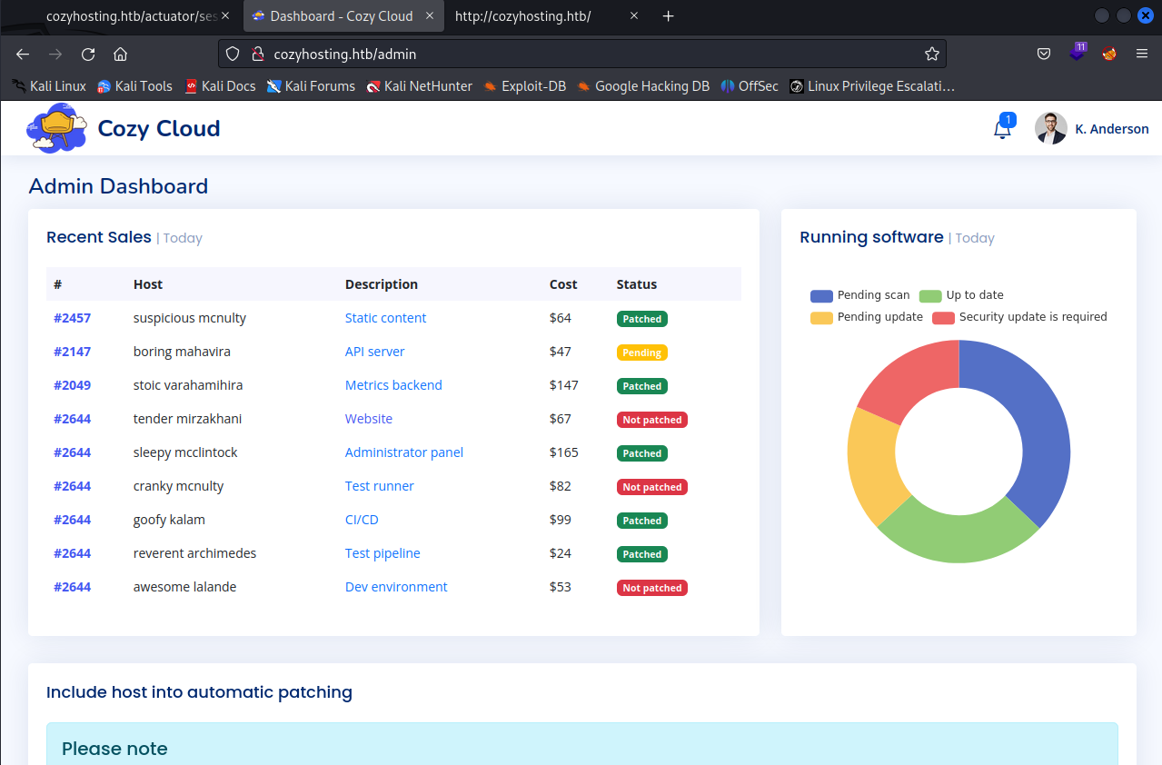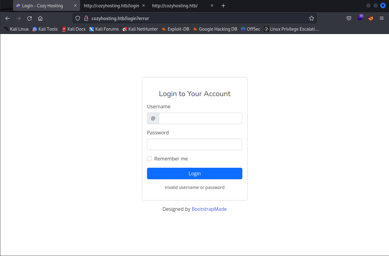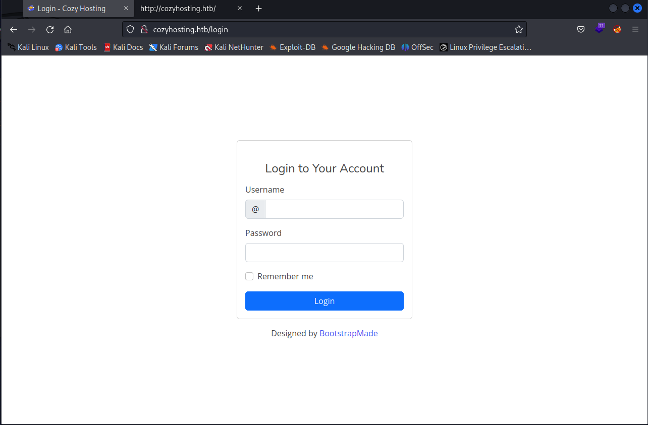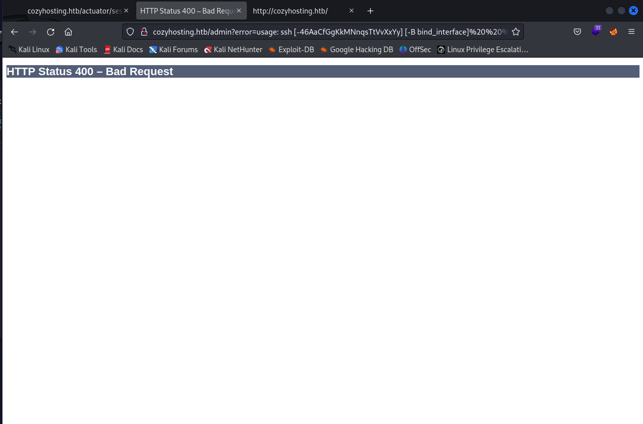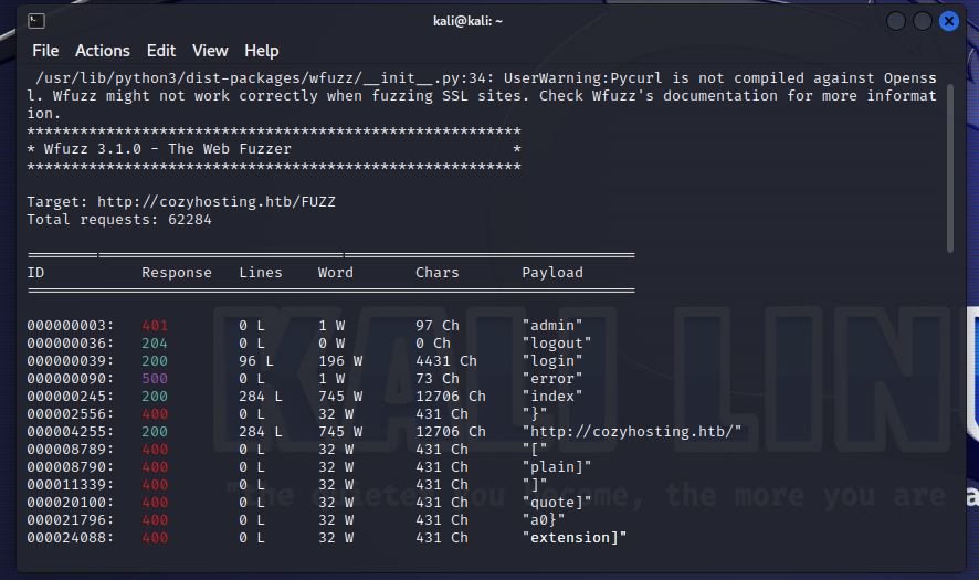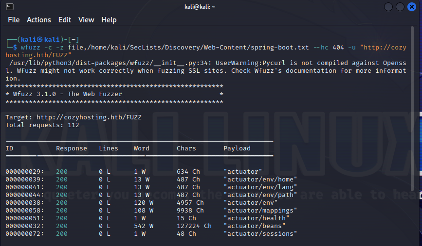 wfuzz -c -f,/home/kali/SecLists/Discovery/Web-Content/raft-large-directories.txt --hc 404 -u "http://cozyhosting.htb"