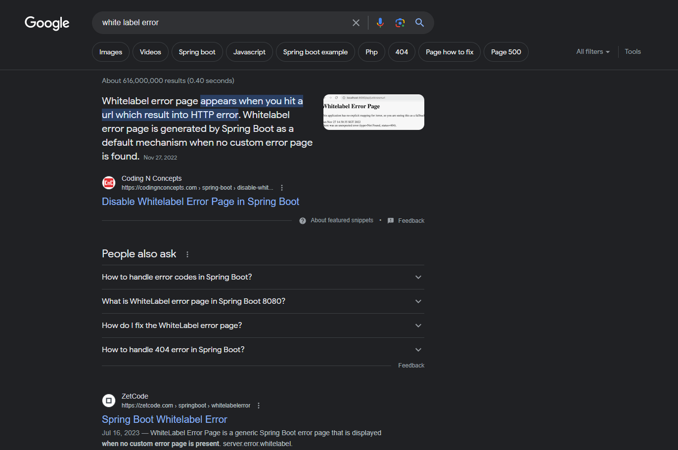 Ah ha, I’ve never seen this kind of error page before, maybe we should look into it. After googling “White Label error”” we were able to get a name for a possible framework running on the website that uses this type of error, the framework is called “Spring Boot”