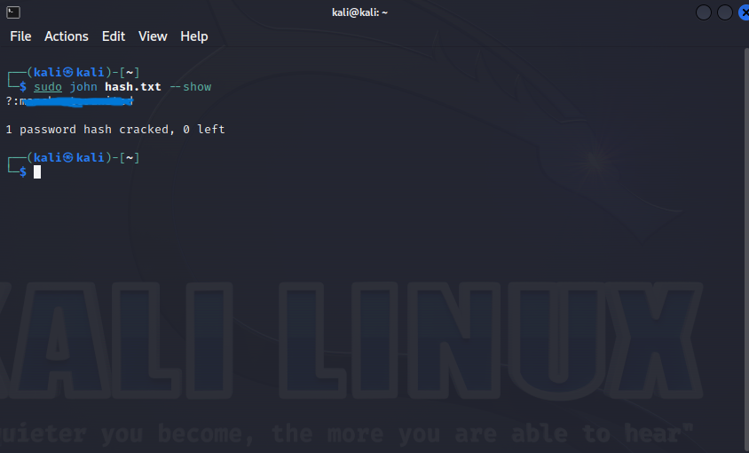 sudo john --wordlist=/home/kali/wordlists/rockyou.txt hash.txt