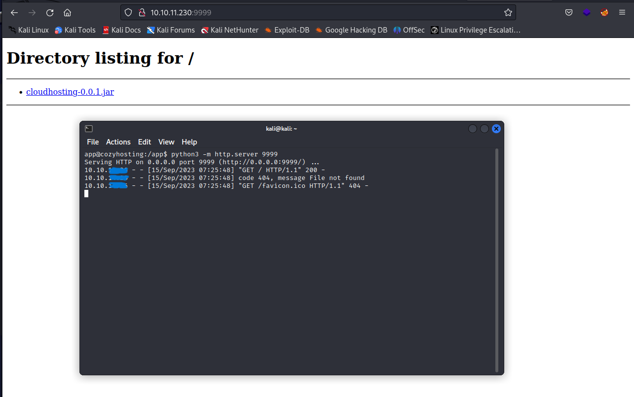 No luck. But if you recall from when we initially got our reverse shell I remember seeing a file labeled “cloudhosting-0.0.1.jar” lets go back to the /app directory and setup a python server so that we can download it on our main machine.