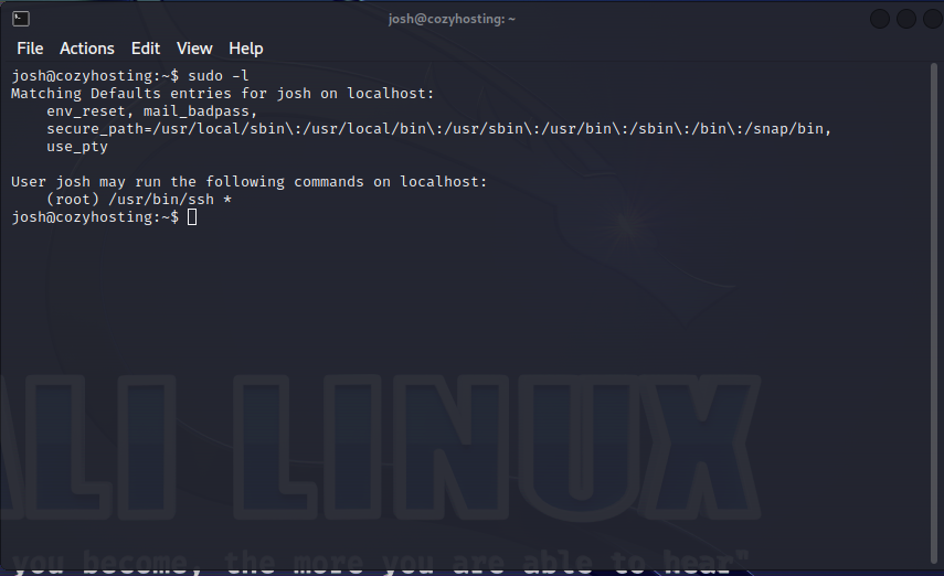 Now lets refer back to the steps from earlier when we first got the rev shell, we have a password for josh so lets try sudo -l first