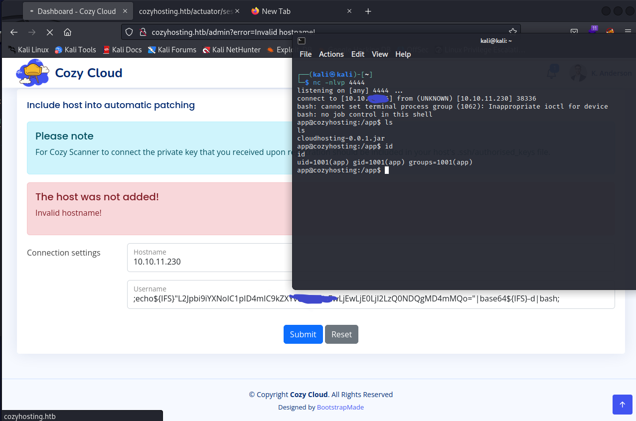 After doing research and trying a bunch of different techniques, I finally found a working payload which utilizes “${IFS}” to represent a space in turn bypassing any possible filters put in place, this followed by a reverse bash shell script encoded in base64. Lets fill in the Hostname parameter with any value and enter our payload in the Username parameter, make sure to startup a netcat listener and cross our fingers hoping for a connection.